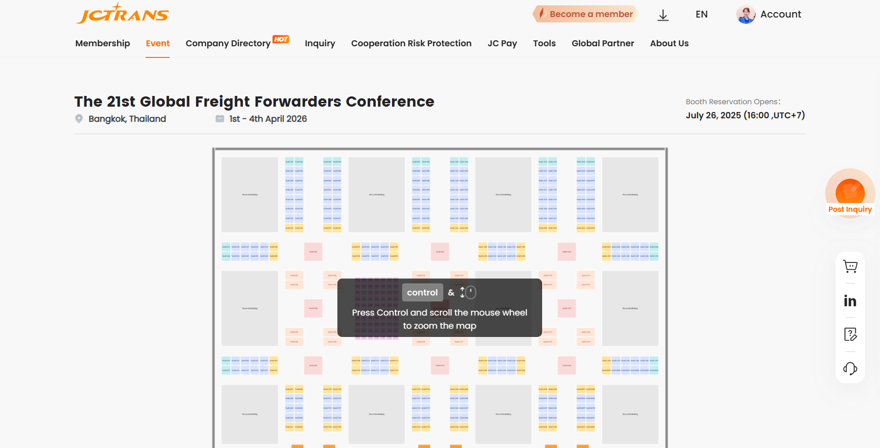 Press "control" on the keyboard and scroll the mouse wheel to zoom in or out the booth map.